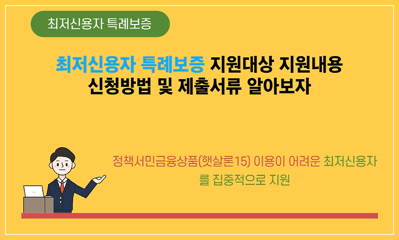 최저신용자 특례보증 제도는 신용이 낮아 대출이 어려운 분들을 위해 마련된 특별한 보증 프로그램입니다. 이 제도는 서민금융진흥원에서 운영하며, 특히, 연체가 경험이 있거나 신용 점수가 낮은 분들은 꼭 알아보시기 바랍니다.