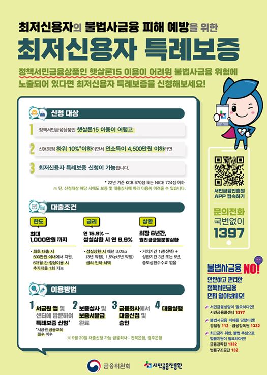 신용점수 하위 10% 이하이면서 연소득 4500만원 이하인 서민을 대상으로 한 ‘최저신용자 특례보증’ 대출상품이 오는 29일 출시된다. 금융위원회는 지난 27일 이같은 내용을 골자로 한 ‘최저신